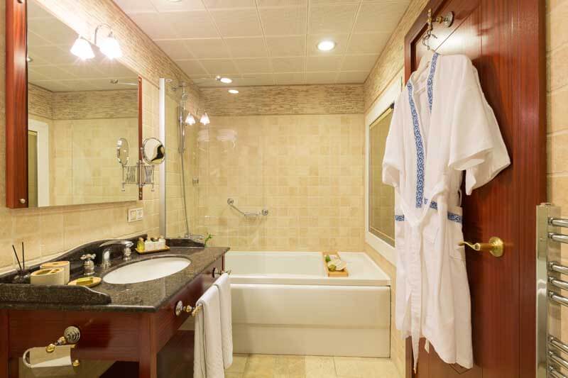 The bathrooms, many with tubs and underfloor heating, come equipped with a range of toiletries, including olive oil soap. They have washcloths, drainplugs, and facial tissues—items not normally found in Turkish bathrooms—as well as hair dryers, make-up mirrors, and heated towel racks.