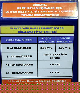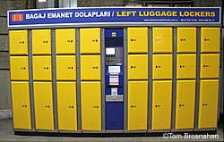 Turkish State Railways (TCDD) has done away with left luggage/baggage checkrooms in all their stations, but in several major stations they have installed bright yellow baggage lockers (Bagaj Emanet Dolapları, bah-GAZH eh-mah-NEHT doh-lahp-lah-ruh).
