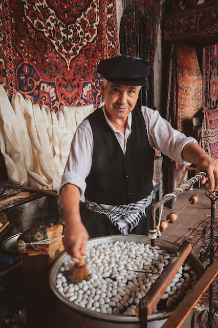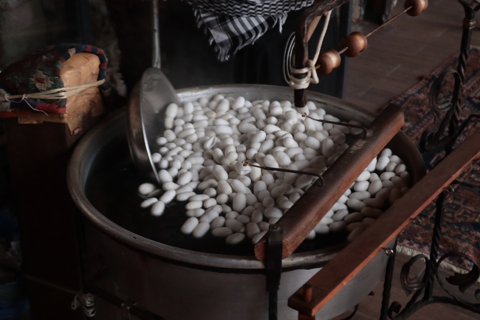 The most precious experience you get when visiting Vezirhan is seeing Selman Öztürk who will introduce you to the very first step of making silk obtained from cones. He devoted his entire life to this job, telling that he could never see himself doing any other occupation.