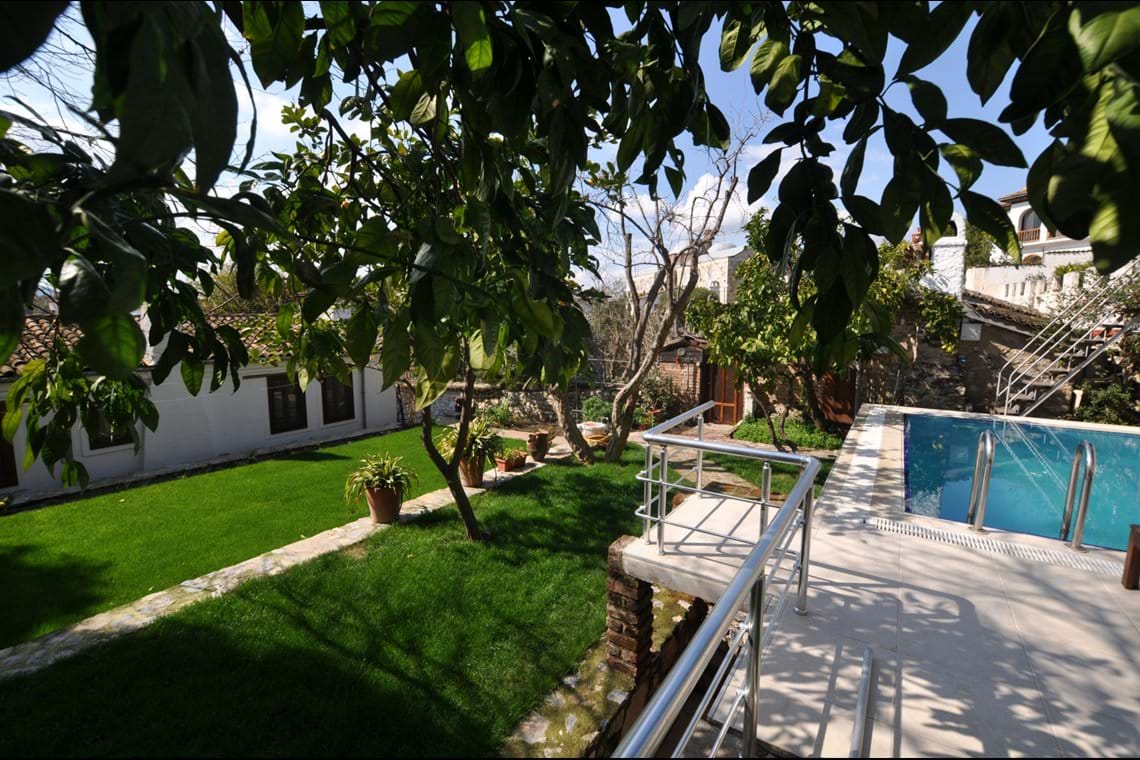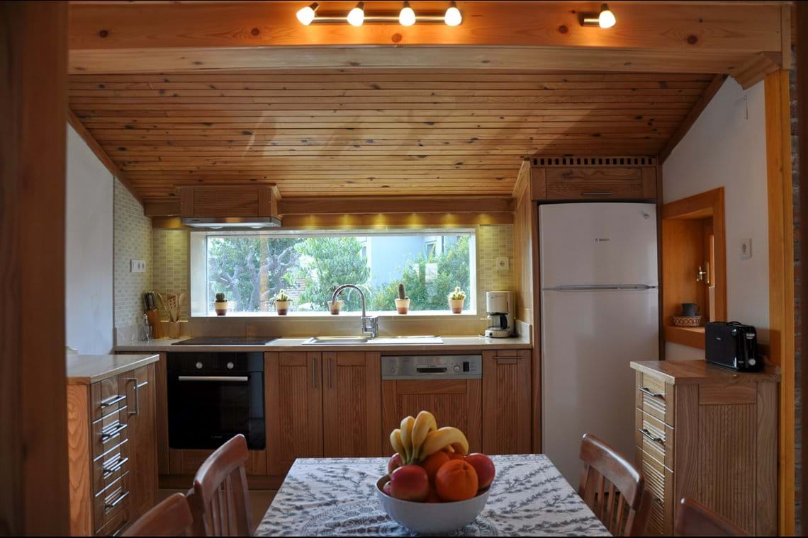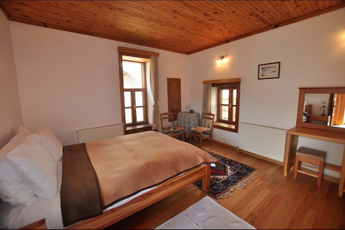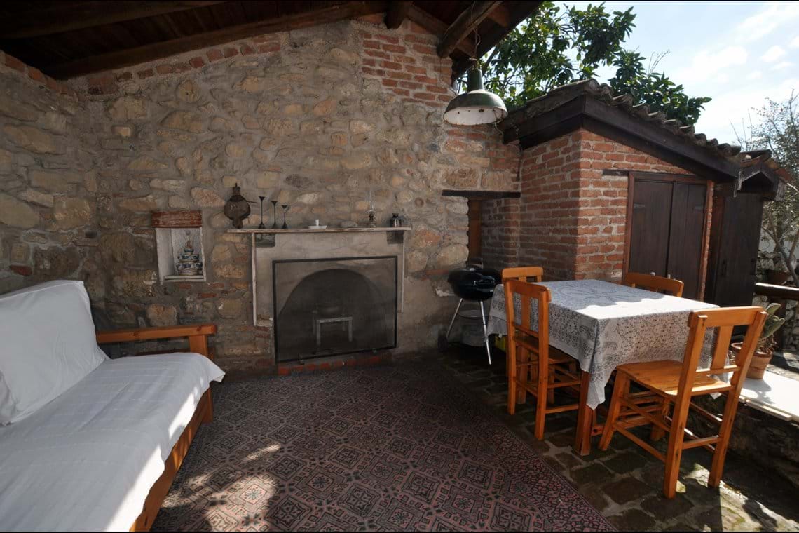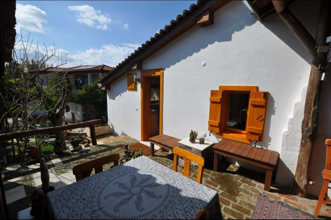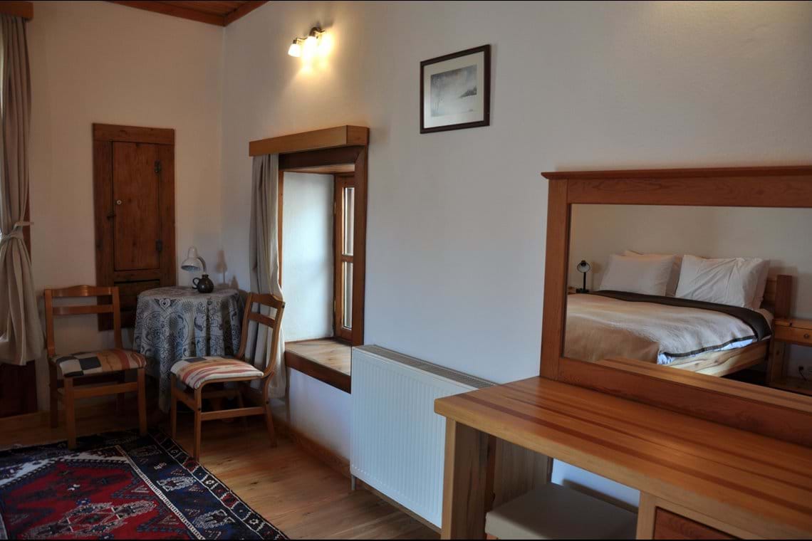 The first bedroom is a double room with wooden floors and ceilings, a handcrafted wardrobe, vanity table, chest of drawers, bedside tables with reading lights, and handmade Turkish carpets. This room also features a huge bookshelf brimming with German, English, and Turkish books. The second bedroom is an extra large space with a single bed, comfortable sofa bed, hand-crafted wardrobe, bedside tables, bookshelves with wonderful reference books, comfortable chairs, beautiful Turkish carpet, and a lovely wood burning fireplace. The modern bathroom features handcrafted cupboards, shower, sink, toilet, and washing machine.