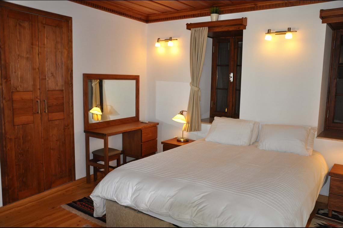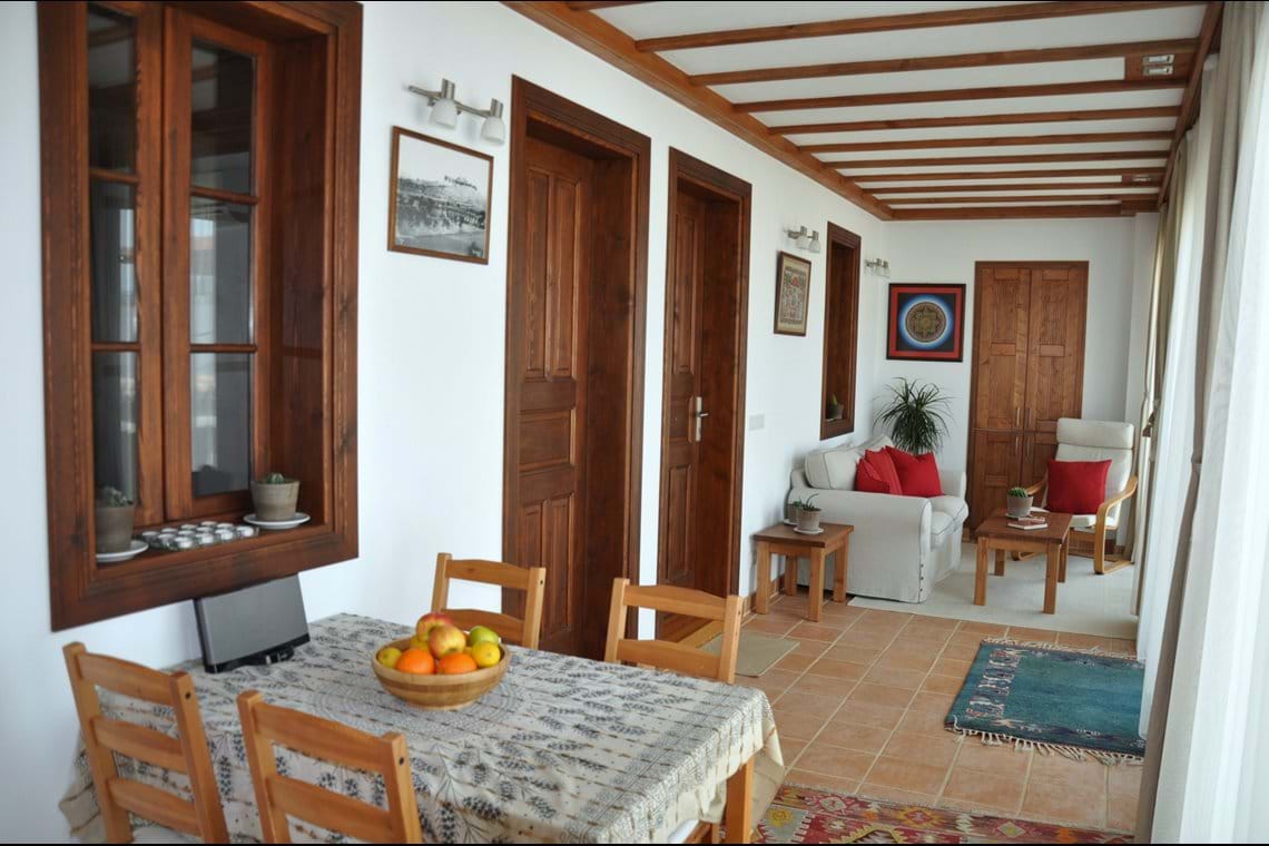 The first bedroom is spacious with a comfortable orthopedic double bed, air-conditioning, wooden ceilings and floors, a built-in wardrobe, vanity table, bedside tables, reading lights, and a small safe. The second bedroom offers a choice of either two single beds or a large double bed, featuring air-conditioning, wooden ceilings and floors, a built-in wardrobe, vanity table, bedside tables, and reading lights. Additionally, there is a comfortable sofa bed that can be opened to make an extra single bed when necessary. The handcrafted kitchen is fully equipped with a large fridge and freezer, cool drinking water, and all appliances and tools guests need for a comfortable stay. The dining room is situated by the kitchen with a dining table and four chairs overlooking the garden patio through a glass door that can be opened fully. A bright lounge creates the perfect space for relaxation with a comfortable sofa, chair, and coffee table, enhanced by the beautiful views of the Byzantine castle. The utility room offers a washing machine, hot water heater, and plenty of storage.