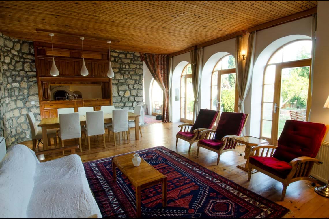 This large room is used as both a living and dining room with a dining table for 10 people and furnished with hand-made Turkish carpets and kilims. This space includes air-conditioning and an open fireplace. Additionally, this beautiful room leads out to the garden.