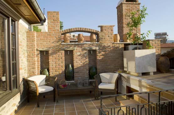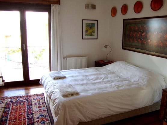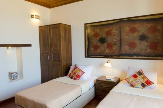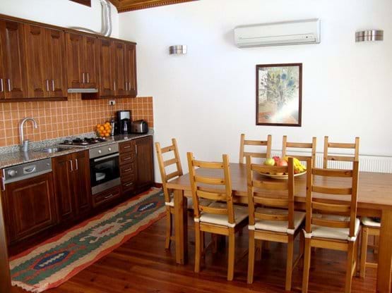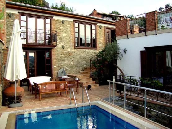 The first of four private bedrooms boasts a private sitting area with wonderful views over the town as far as the beach. This room features hand-crafted wood ceilings and furniture as well as Turkish handmade kilims. Additionally, this room has access to satellite television, a DVD and MP3 player, and air-conditioning. A second bedroom can be used as either a double bedroom or two separate beds. Handmade furniture and handcrafted ceilings and floors define this room. The third bedroom is a large double bedroom with handmade furniture and details leading to the pool area. This room also includes satellite television, a DVD and MP3 player, and air-conditioning. The final bedroom is a sitting room that can be turned into a bedroom using a comfortable sofa bed.