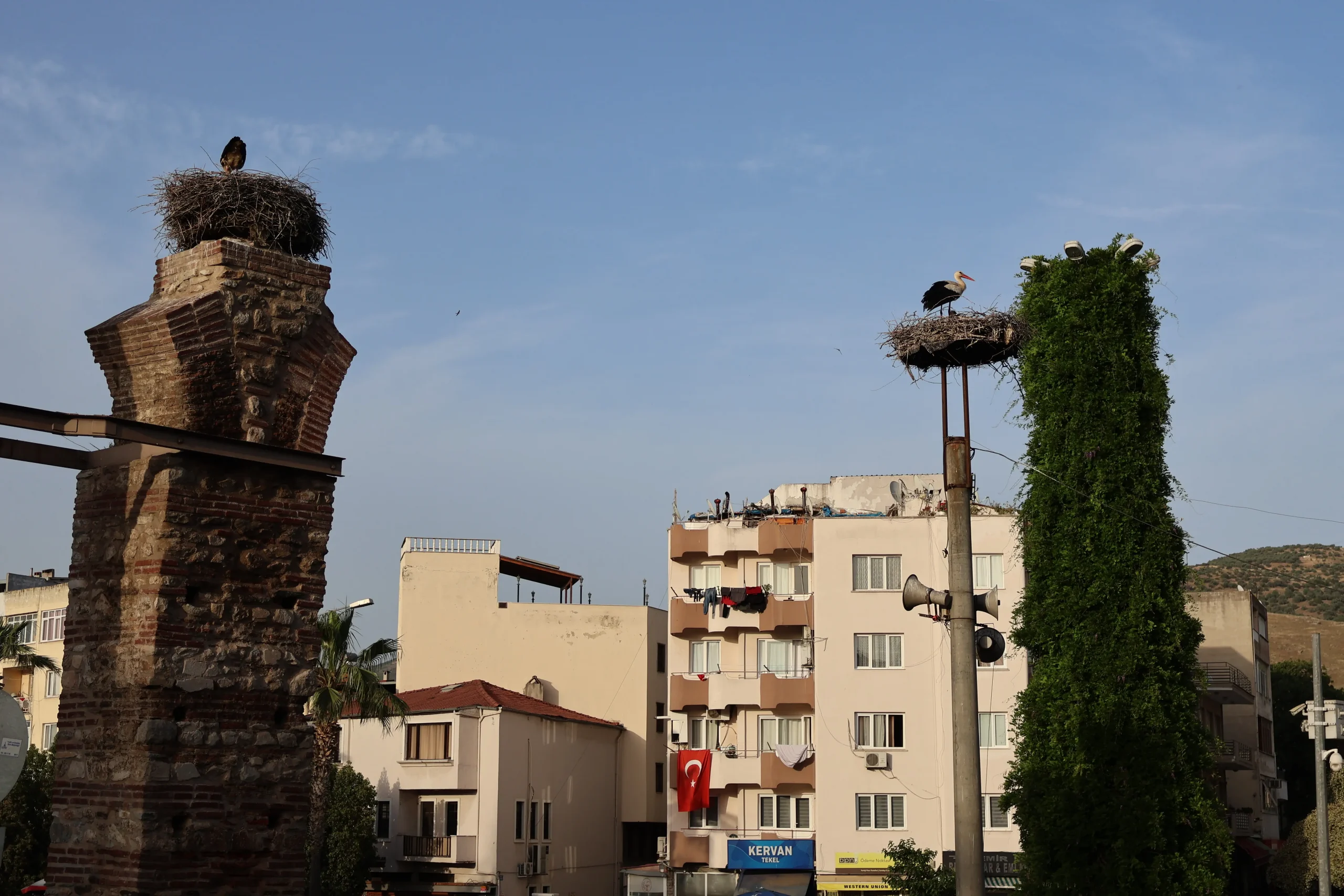 Selçuk also has storks! The town is a favorite nesting place for the leggy birds, who take up residence here on the pillars of the old Roman aqueduct, the disused minaret of a ruined mosque, the one remaining column of the Artemision, television aerials, and any other safe perch, from April into September.