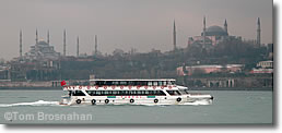 A TurYol boat cruises past the Blue Mosque (left) and Aya Sofya (right) on its way up the Bosphorus.