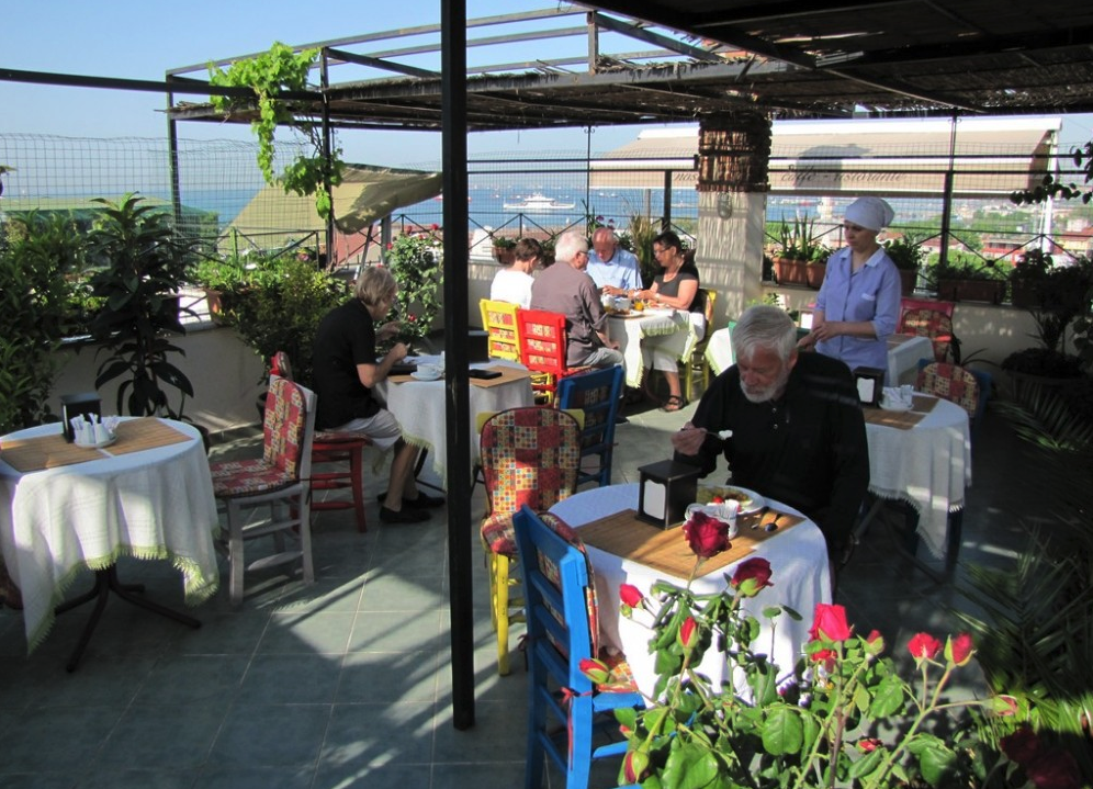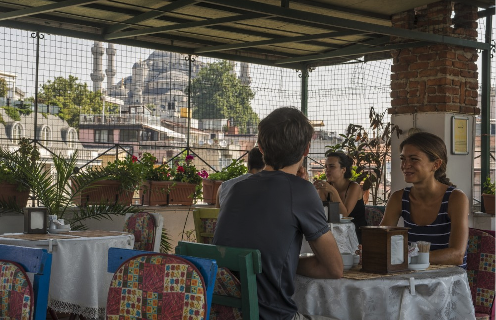A sunny upper-level breakfast room offers views to the north of the Blue Mosque to the north, and Küçük Ayasofya, and the Sea of Marmara to the south. After breakfast, coffee, tea, cake, and cookies are available here all day long to guests at no cost.