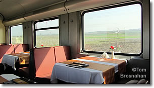 When I take a TCDD sleeper train, I usually have breakfast in the dining car. It's a traditional Turkish breakfast of white and yellow cheese, sliced mild beef sausage (served cold), black and green olives, sliced tomatoes and cucumbers, bread, butter, fruit jam, honey, and coffee or tea, for TL10.